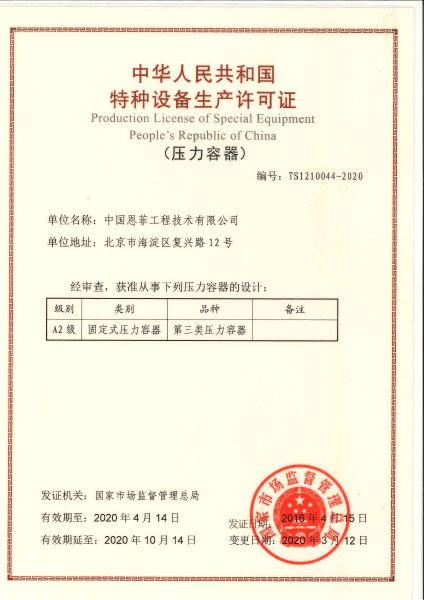 中華人民共和國(guó)特種設(shè)備生產(chǎn)許可證(壓力容器)